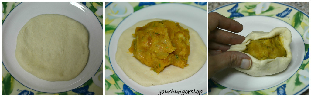 - Place one portion of stuffing on the dough. Seal the ends together as shown in the picture.