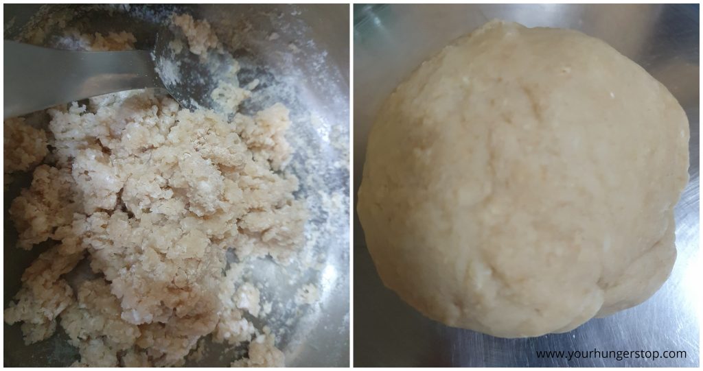 - Lower the heat and add maida. Stir and mix till the flour comes together into a ball